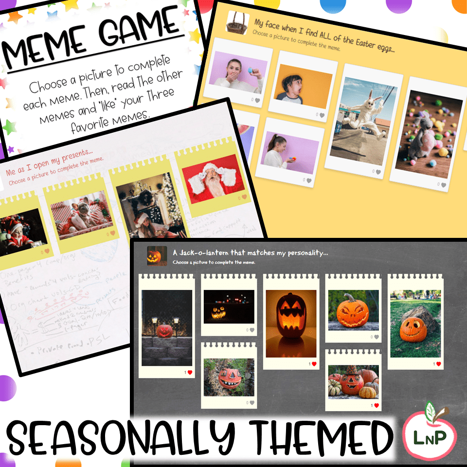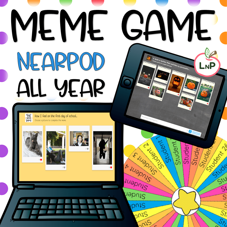 For those of you who have been using the Fun Friday Nearpod games that were posted last year…the wait is over!!! If you have not had the chance to check out our most popular Fun Friday games, make sure to check out this Nearpod resource or all-inclusive year-long bundle. I have created several ice breaker games and Fun Friday activities, but BY FAR, our most popular game amongst upper-grade students is the Meme Game. Due to popular demand, we now have a Nearpod resource entirely dedicated to the Meme Game. It includes slides for EVERY MONTH OF THE YEAR. Your students are sure to love it!!! First, let’s learn how to play…