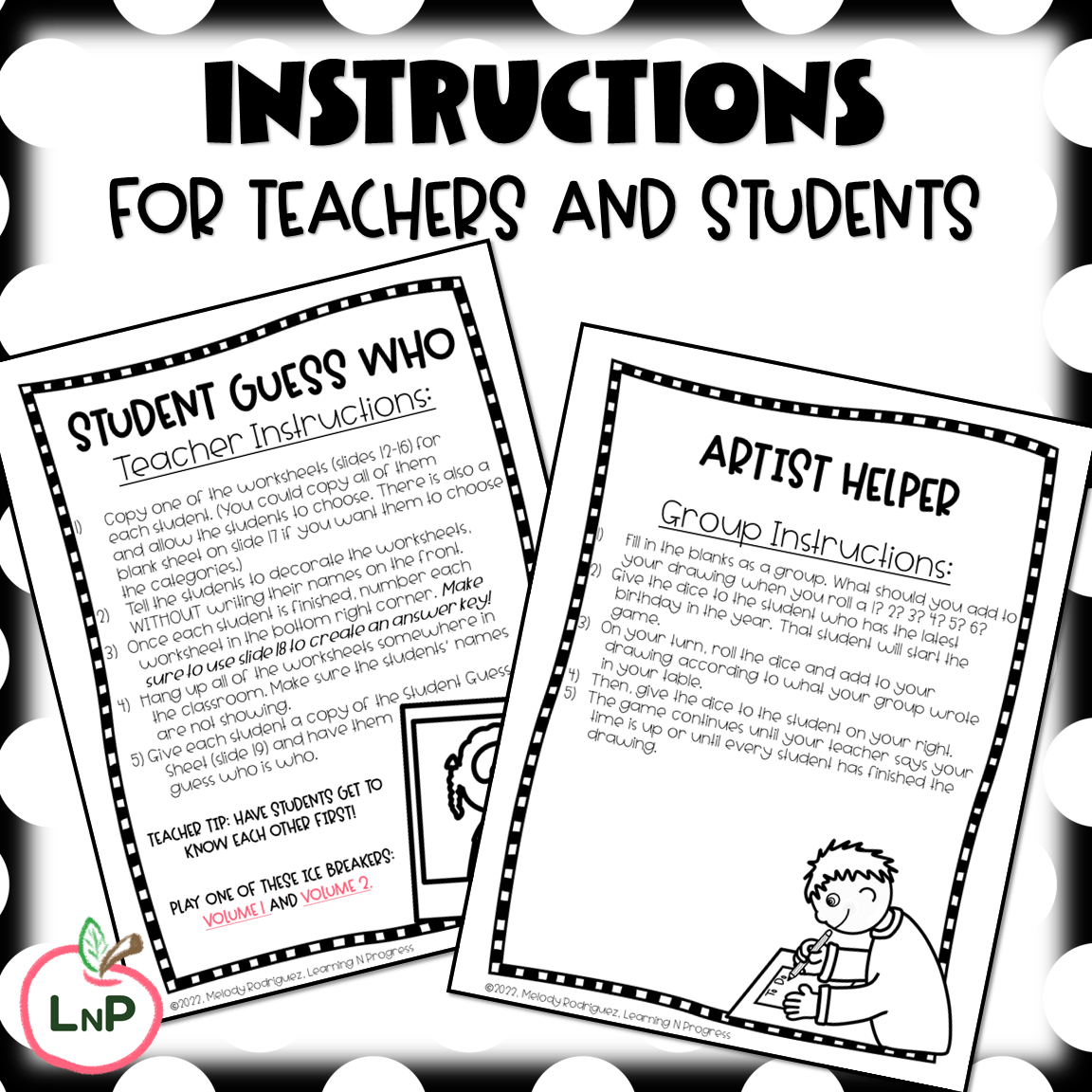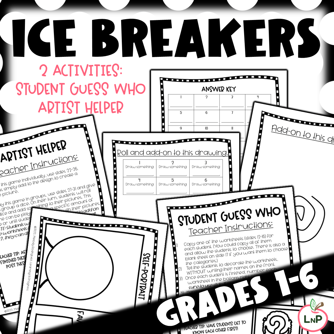 Need ideas for the first day of school? Look no further! This resource comes with two ice breaker games: Student Guess Who and Artist Helper. Student Guess Who will help your students get to know each other, and Artist Helper will bring out their creativity! These ice breakers are ideal for grades 2-5 but can be adapted for other grade levels.