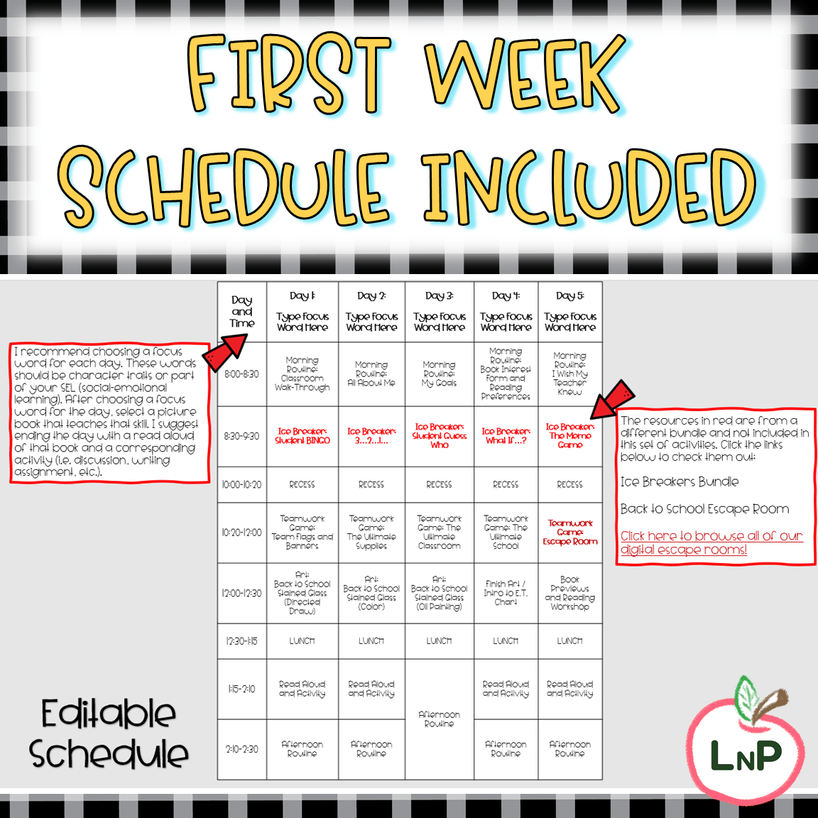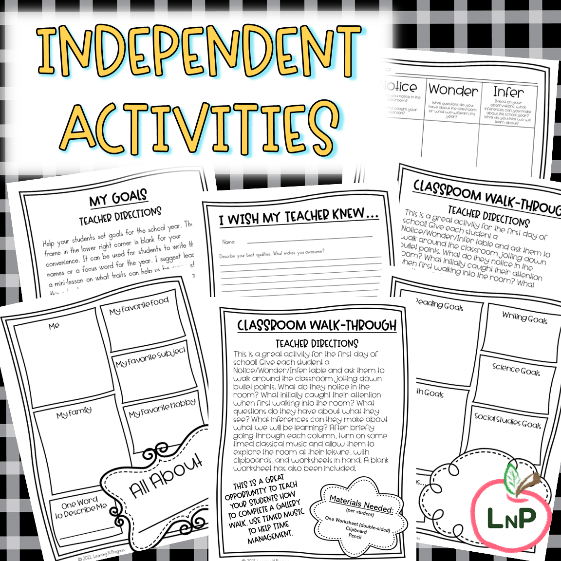 This pack of printable worksheets includes teaching tips, an editable schedule, design challenges, and several independent back-to-school activities to help you get to know your students. Independent activities include All About Me, I Wish My Teacher Knew, Book Interest and Reading Preferences forms, and more!